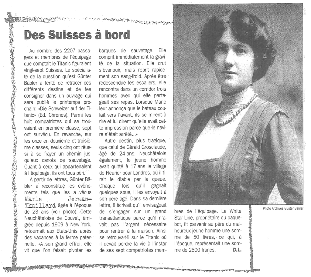 Marie Jerwan, née Thuillard, au Mont de Couvet, était une rescapée du naufrage du Titanic.